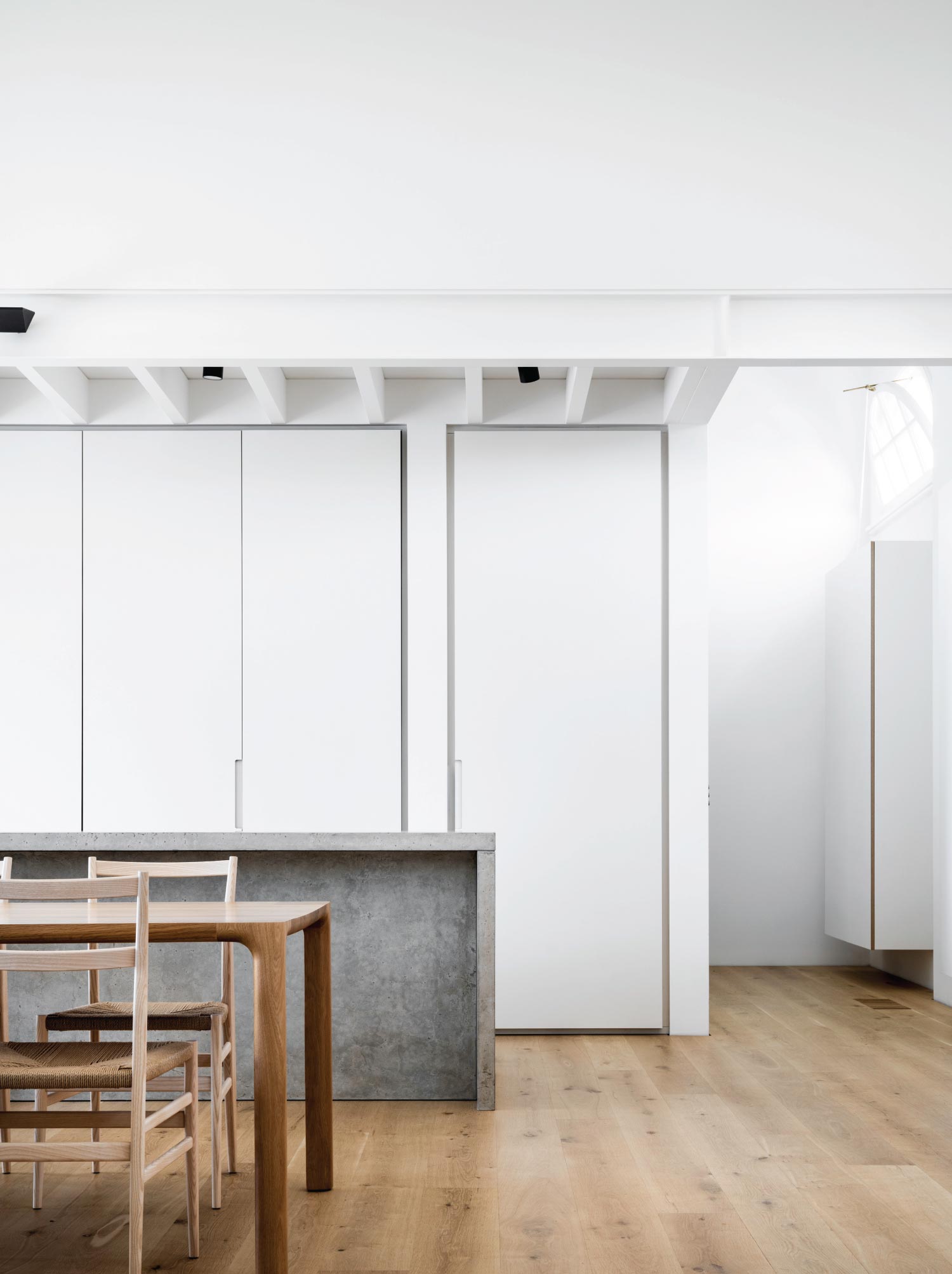 Inside, the character of the former fire station is celebrated rather than concealed. High ceilings retain the original framing and exposed beams, creating crisp lines and generous volume throughout.