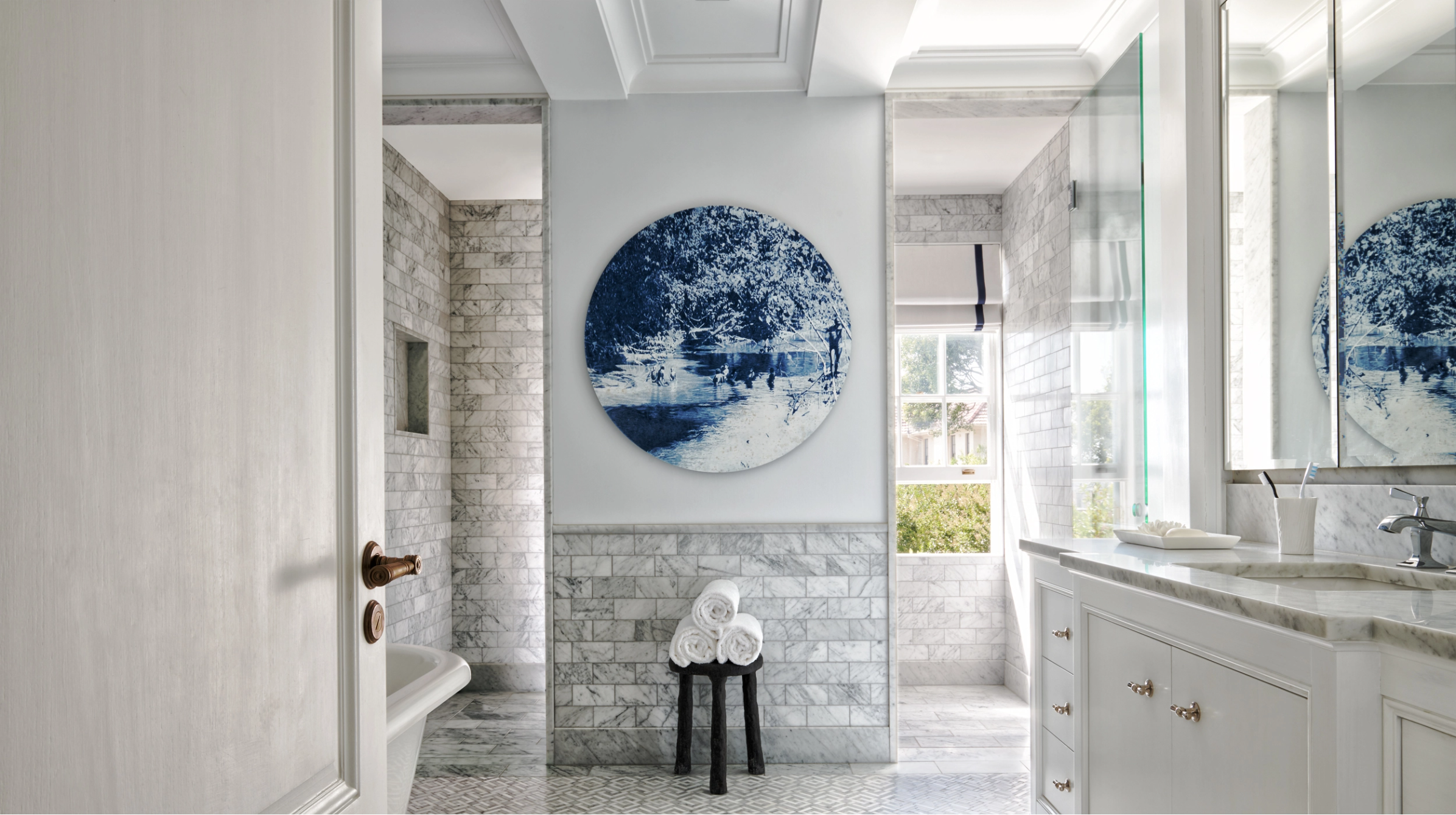 This luxurious property showcases a masterful blend of textures, where every detail is flawlessly executed from cornice to wallpaper, brass angle to stone tile, antique mirror to stone, and timber moulding to column.