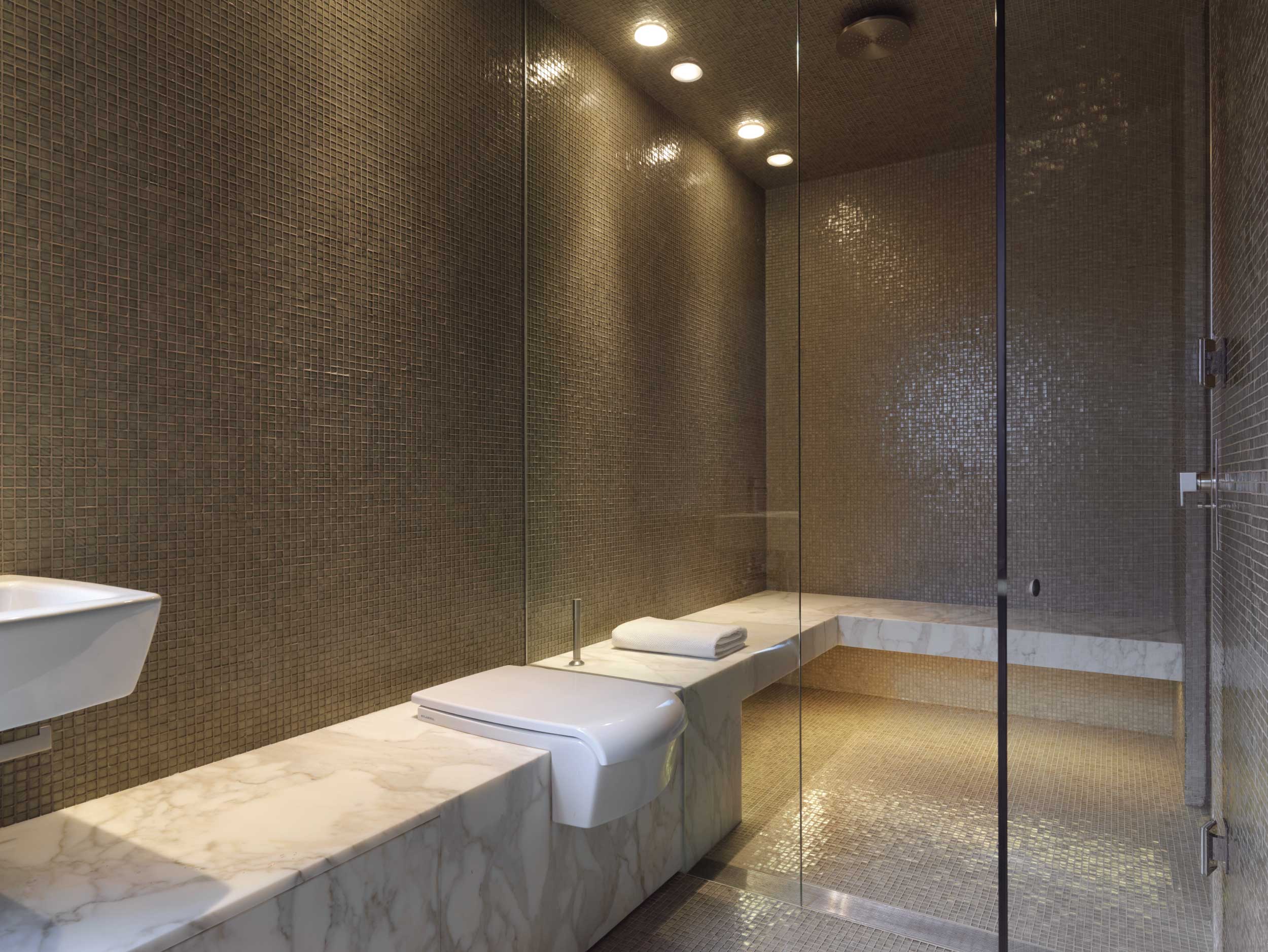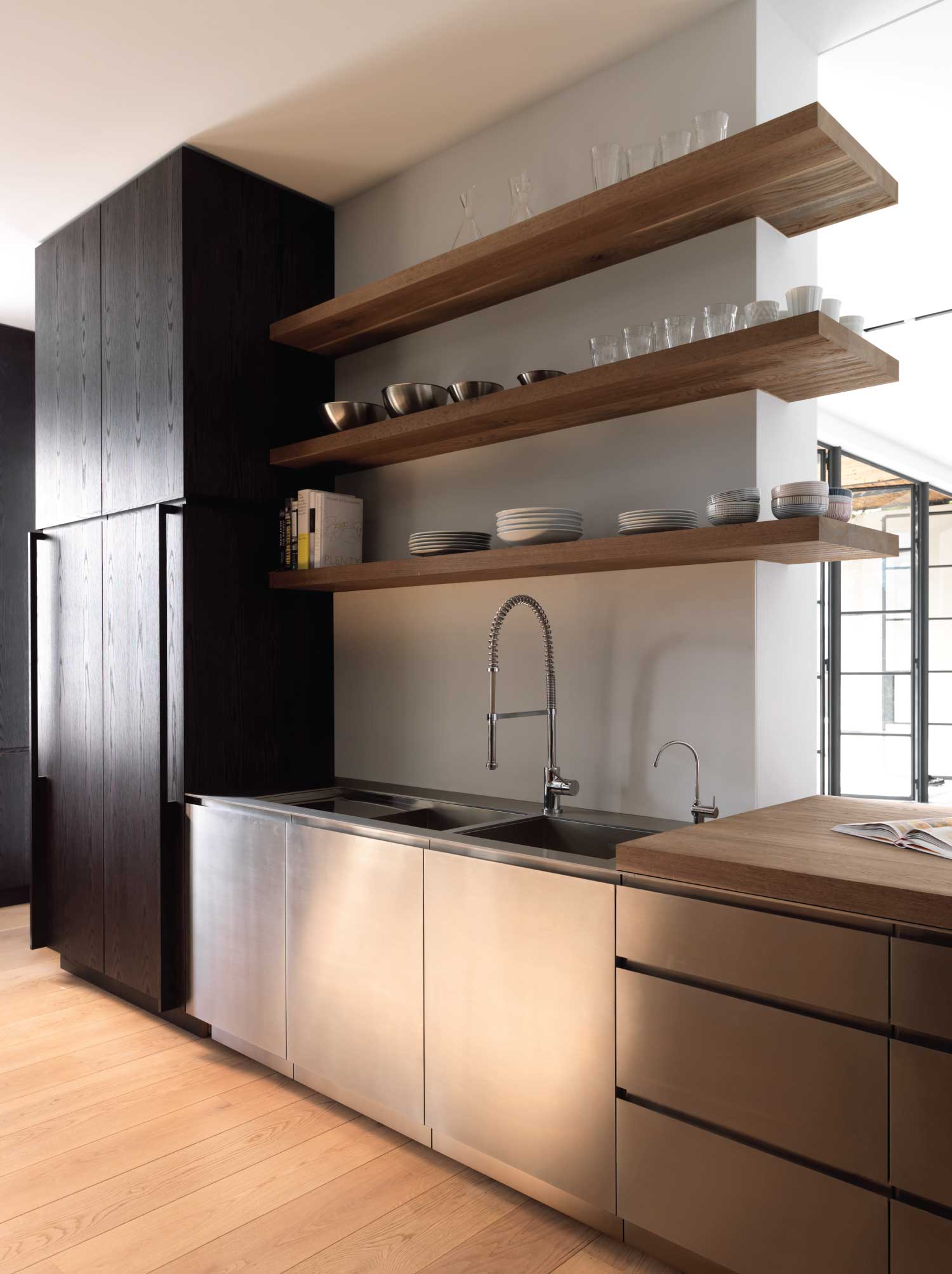 Old-world classic style morphs into a modern sophistication via a newly constructed wing. A contemporary large kitchen and family room with polished concrete floors and crisp lines flows out to a gravel terrace, and is aesthetically linked with the old wing through the use of oversized steel-framed windows and doors.