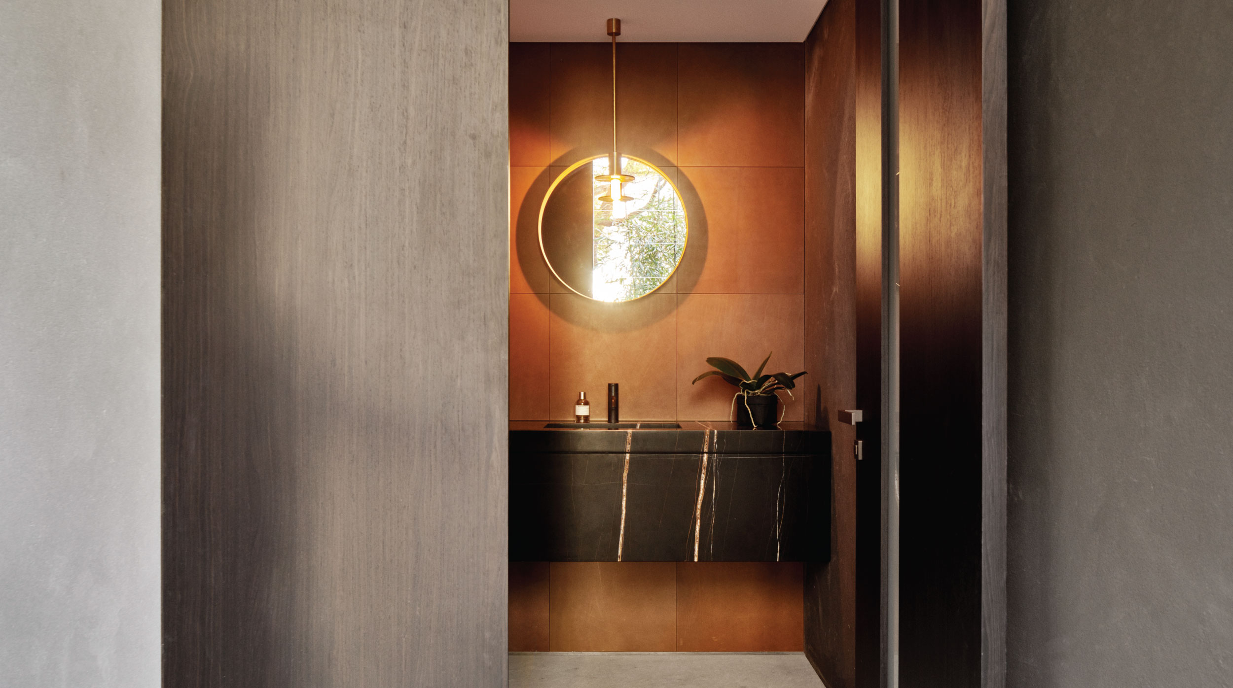 The diverse blend of materials and textures applied to the home’s interiors achieves a functional yet unique design. The extensive use of stone throughout the contemporary pavilion – Calacatta marble, Nero Tempesta and Aren Grigis limestone gives the building a strong and solid feel, which is balanced by the warmth of timber flooring, leather wall tiles and textured Pandomo wall finishes. Bronze cladding, stainless steel and polished concrete also introduce an industrial twist.